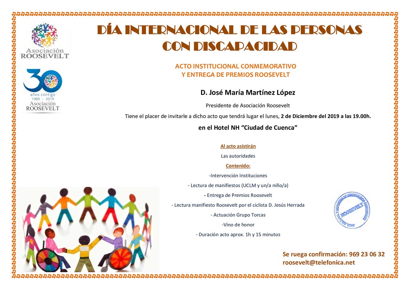El día 3 de Diciembre de cada año se celebra el Día Internacional de las Personas con Discapacidad, y la Asociación Roosevelt, como asociación del sector, quiere aprovechar este día para reivindicar los derechos de las personas con discapacidad y celebran un acto Institucional Conmemorativo, al cual se invita a todos los sectores de la sociedad: Instituciones, partidos políticos, empresarios, sindicatos, mundo del deporte, mundo de la cultura, socios, ONG, etc. y dónde se leen distintos comunicados procedentes de diversos profesionales, estudiantes universitarios y escolares, y un manifiesto elaborado por la Asociación Roosevelt con motivo de dicho día