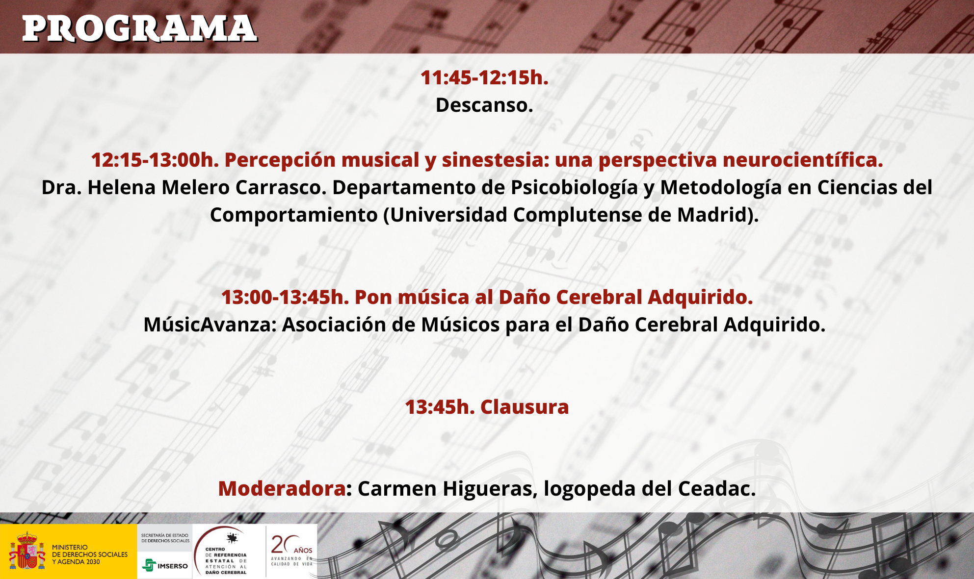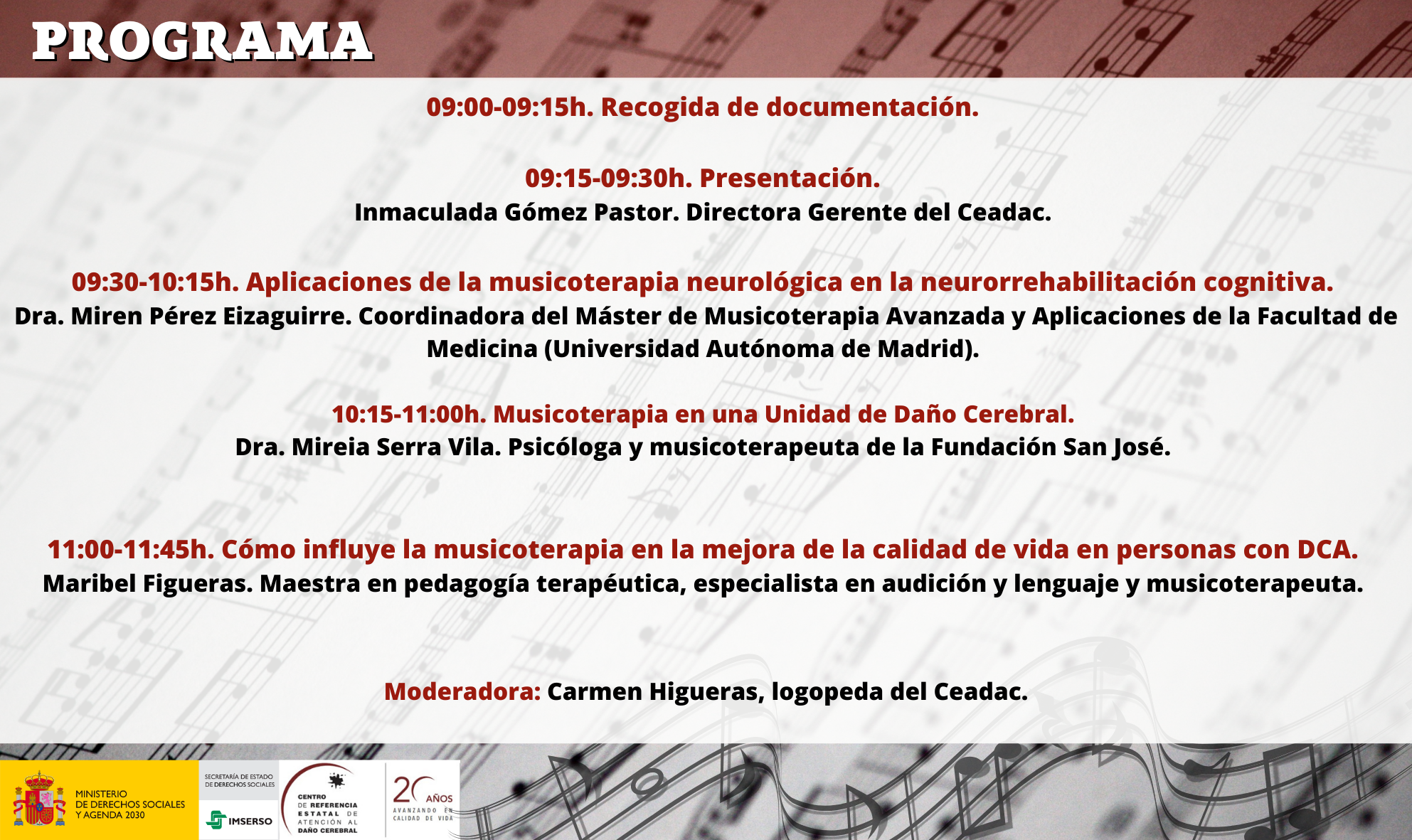- 09:30-10:15h. Aplicaciones de la musicoterapia neurológica en la neurorrehabilitación cognitiva.