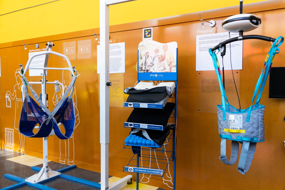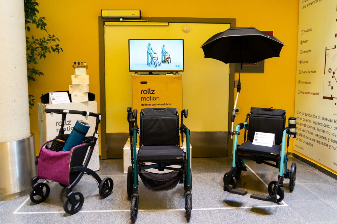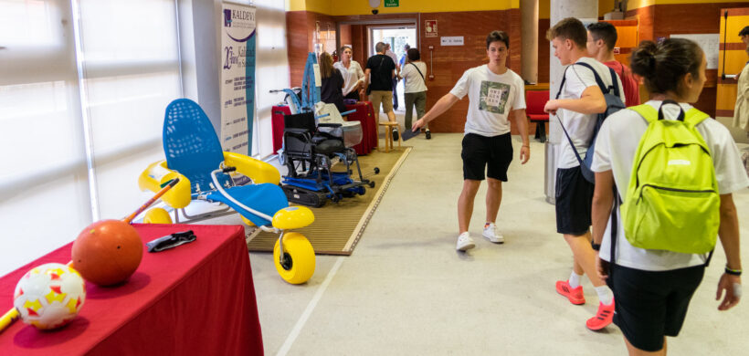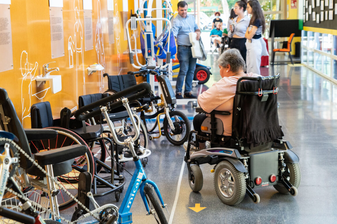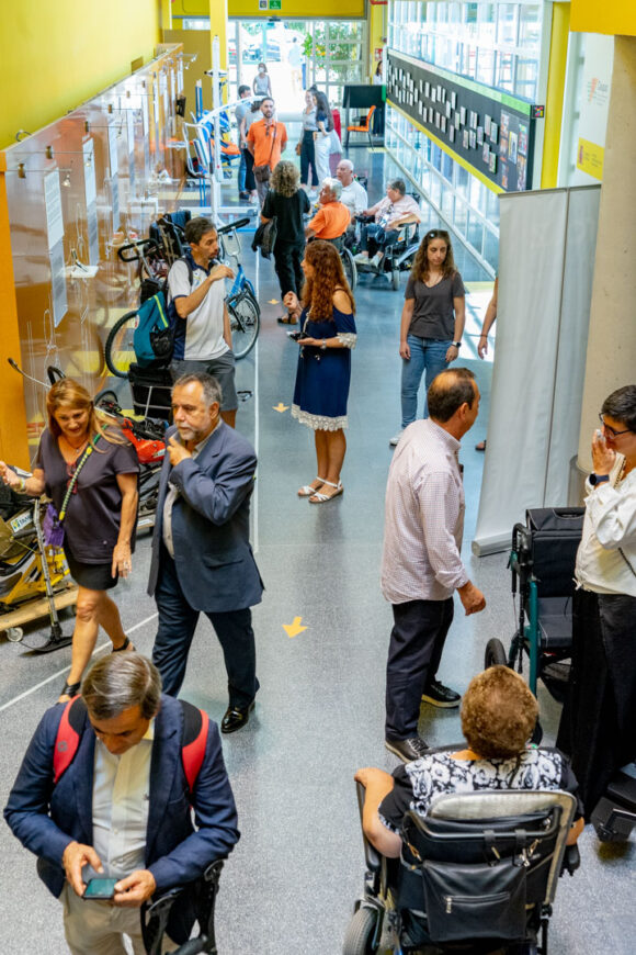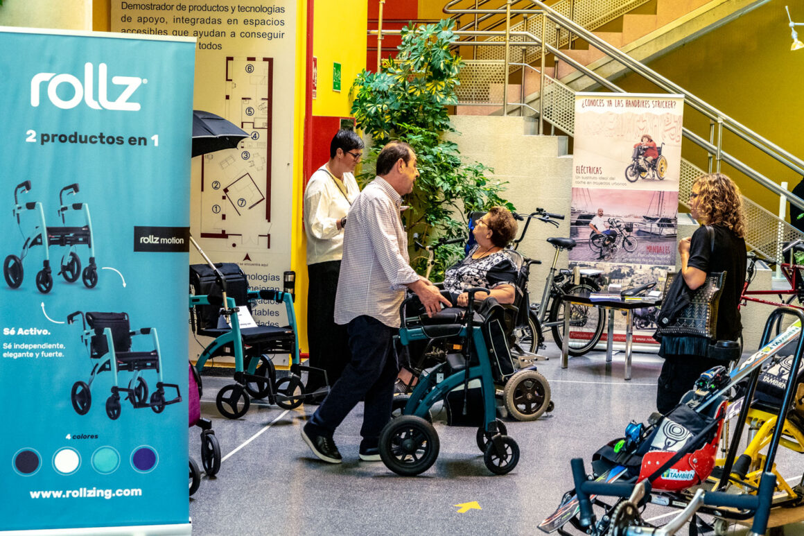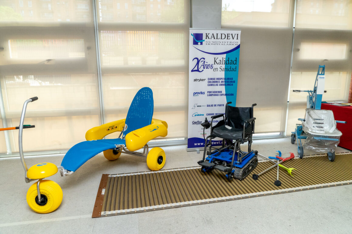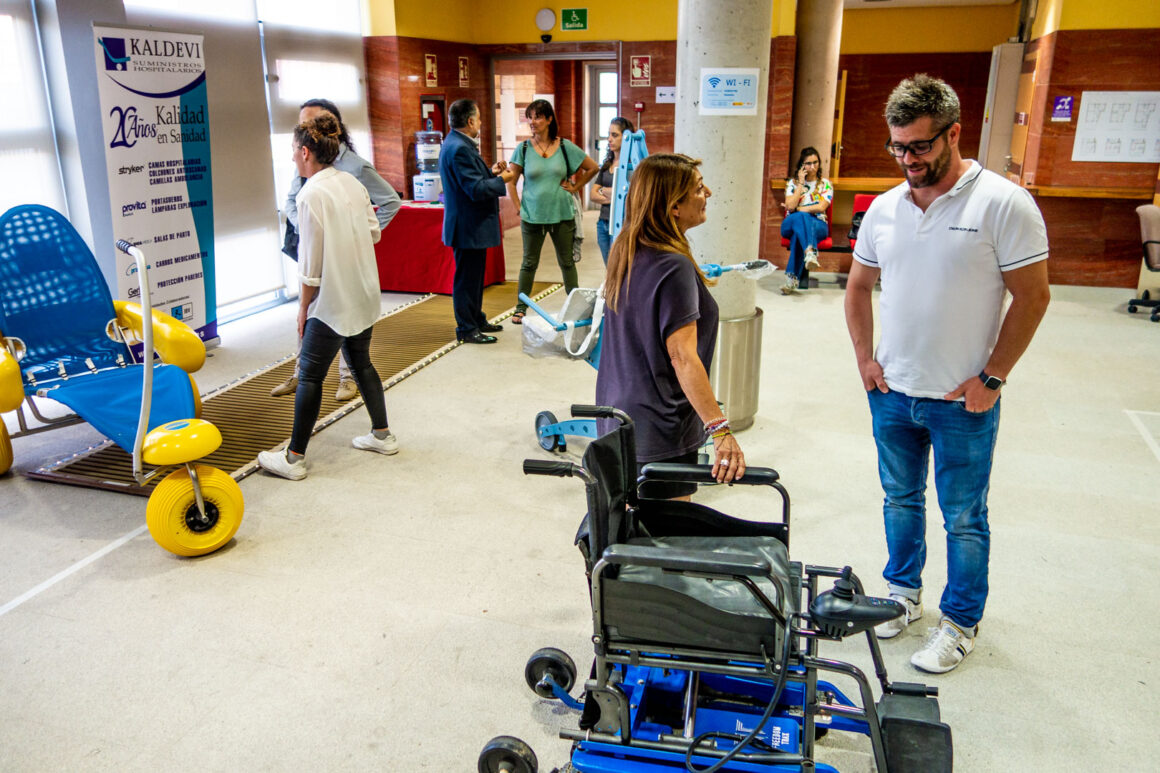 Antes de volver al salón de actos tuvimos la oportunidad de ver y probar numerosos productos de apoyo para la práctica del deporte para personas con discapacidad. Estos productos se encontraban en diferentes estands a cargo de las empresas: Winncare Spain, Sunrise Medical S.L., Fundación También, Rollzing, Rodem Ortotec S.L., Novaf Andalucía 2007, S.L., Kaldevi Ingeniería Geriatrica, S.L., Federación Española de Deportes para Ciegos y Federación de Deportes de Montaña y Senderismo de Castilla y León.