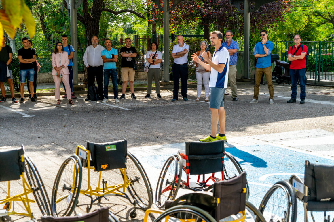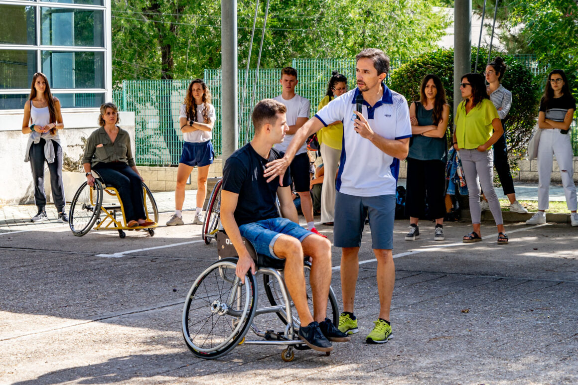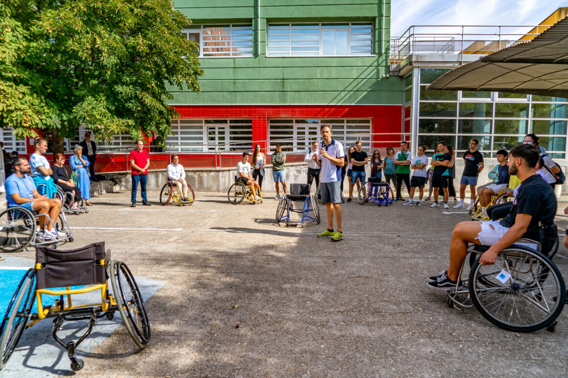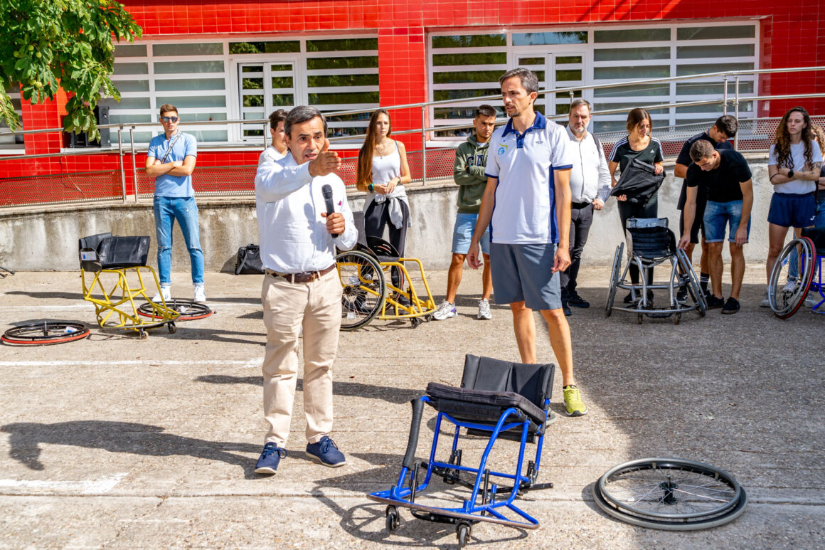 La jornada tuvo una primera práctica en el exterior de las instalaciones del Ceapat con Javier Pérez y sus alumnos de la Escuela de Doctorado y del Grado de Ciencias del Deporte de la UPM. Javier explicó las partes de la silla de ruedas para el deporte; analizó el chasis, los asientos, los respaldos, la angulación de las ruedas posición de las mismas variando el eje de las ruedas y su autopropulsión adecuada para sacar el máximo rendimiento en el desplazamiento y para el objetivo deportivo protegiendo al máximo los hombros.