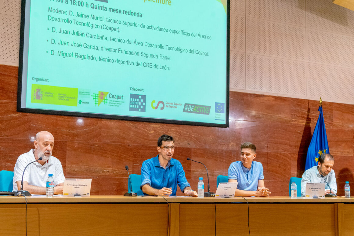 Se reservó para el final la mesa de los centros de referencia del Imserso que trabajan para dar cabida al deporte inclusivo en diferentes ámbitos, y siempre en línea con los objetivos estratégicos del Instituto. Fue moderada por Jaime Muriel Isidro, técnico superior de actividades específicas del Área de Desarrollo Tecnológico (Ceapat). La primera intervención de esta 5ª mesa la llevó a cabo Juan Julián Carabaña, Maestro Taller del Ceapat, que mostró los distintos productos de apoyo que se están diseñando en el centro para diferentes usos de los deportistas de base. En segundo lugar intervino Juan José García, Técnico en el Ceadac y Director de la Fundación Segunda Parte, con una charla muy interesante sobre la actividad física y el deporte para personas con daño cerebral adquirido, no sólo como un elemento rehabilitador sino también conductual.. Por último Miguel Regalado, Técnico deportivo externo del CRE de León, y encargado de llevar a cabo los programas deportivos en este centro, que van desde el esquí hasta las actividades subacuáticas con personas con grave discapacidad física.