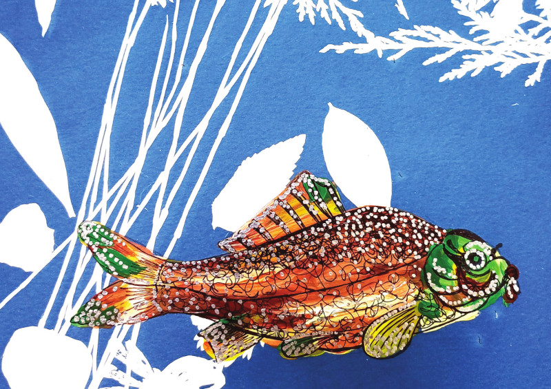 Durante 2024, se han estado formando y produciendo piezas artísticas utilizando la técnica de la cianotipia, un proceso fotoquímico que consiste en aplicar una emulsión química sobre una superficie porosa, exponerla a la luz solar y luego enjuagar con agua para obtener distintos tonos de azul y fijar la imagen. En este caso, se han utilizado hojas y flores recolectadas y prensadas del propio jardín de la Fundación. Sobre esta base, y tras estudiar la fauna de la Albufera, han dibujado, coloreado y repasado con tinta los diferentes peces y aves seleccionados.