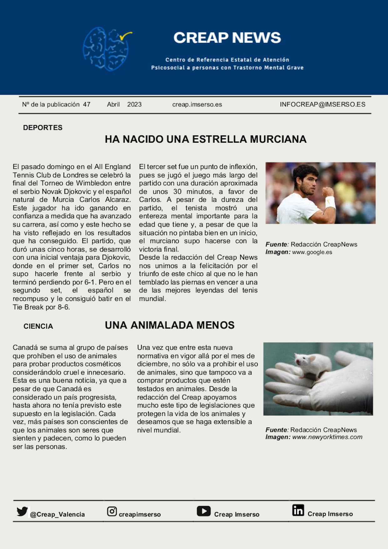 - En el nº 58 encontramos las secciones de deportes y ciencia. Por un lado, en la sección de deportes se destaca la figura de Carlos Alcaraz, campeón del torneo de Wimbledon de 2023. Desde la redacción felicitan a Carlitos por su gran logro y valoran especialmente la entereza mental que demostró el murciano en el partido, al recomponerse tras un mal comienzo. Por otro lado, en la sección de ciencia, encontramos la noticia de la prohibición en Canadá del uso de animales para el testado de productos cosméticos. Una noticia que desde la redacción del Creap celebran y esperan que se haga extensible a nivel mundial.