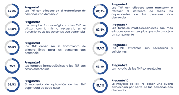 • La mayoría de los participantes considera que las TNF son eficaces en el tratamiento de los síntomas de la demencia y que tienen una buena eficacia en el mantenimiento o retraso del deterioro en diferentes ámbitos.