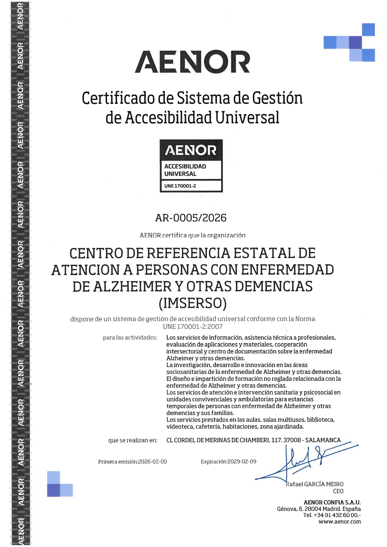 El Centro de Referencia Estatal de atención a personas con enfermedad de Alzheimer y otras demencias del Imserso ha obtenido, con fecha 9 de febrero de 2026, la Marca AENOR que certifica su Sistema de Gestión de la Accesibilidad Universal conforme a la norma UNE 170001-2:2007.