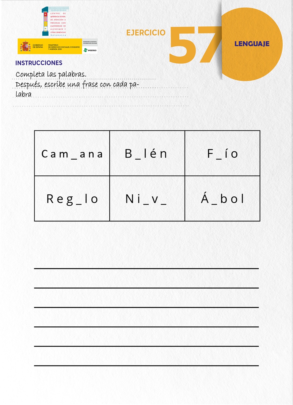 En esta ocasión, el centro de referencia del Imserso en Salamanca ha optado por un ejercicio para potenciar el lenguaje en demencias avanzadas en el que la persona debe indicar la letra que falta para completar una serie de palabras y posteriormente hacer una frase con cada una de ellas.