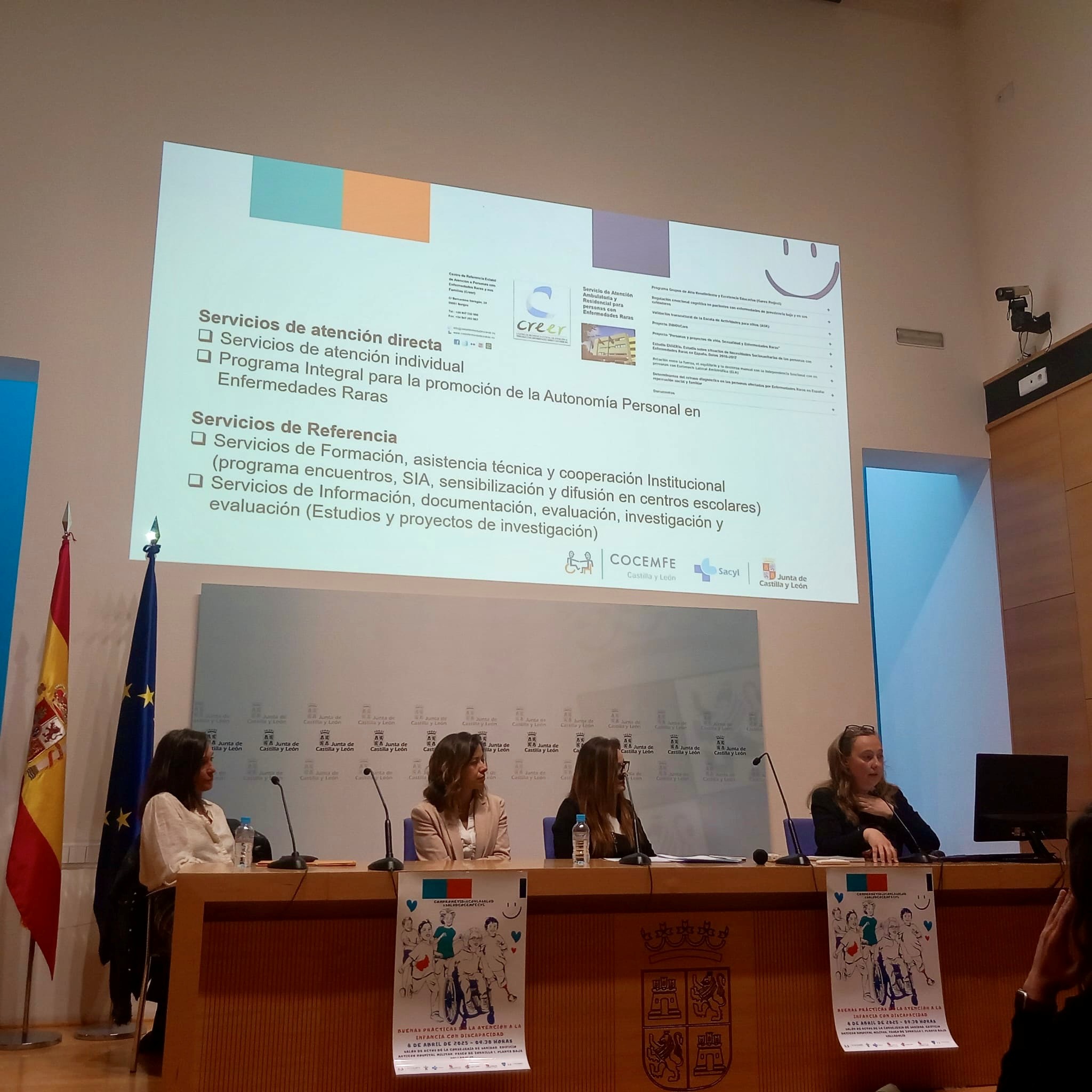 Mª Jesús Ladrón de Guevara Font, terapeuta ocupacional del Centro de Referencia Estatal de Atención a Personas con Enfermedades Raras y sus Familias (Creer), del Imserso en Burgos, ha participado el martes 8 de abril en la Jornada "Buenas prácticas en la atención a la infancia con discapacidad", organizada por CocemfeCyL en Valladolid. Ha impartido la ponencia "Abordaje de las necesidades de la infancia con enfermedades raras", en la que además ha presentado los programas y servicios del Centro.