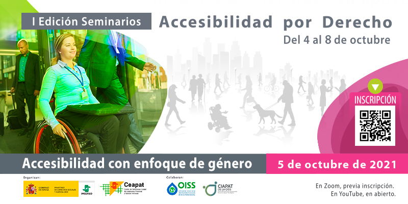 El seminario del día 5 de octubre de 2021 abordó la «Accesibilidad con enfoque de género». Desde Ceapat, Imserso, la incorporación de esta perspectiva en la aplicación de medidas de accesibilidad a entornos, procesos, bienes, productos, servicios, objetos, instrumentos, herramientas y dispositivos, supone poner de manifiesto los obstáculos que las mujeres y niñas con discapacidad, pueden encontrar en su acceso y si las barreras se producen a consecuencia de la intersección entre género y discapacidad.